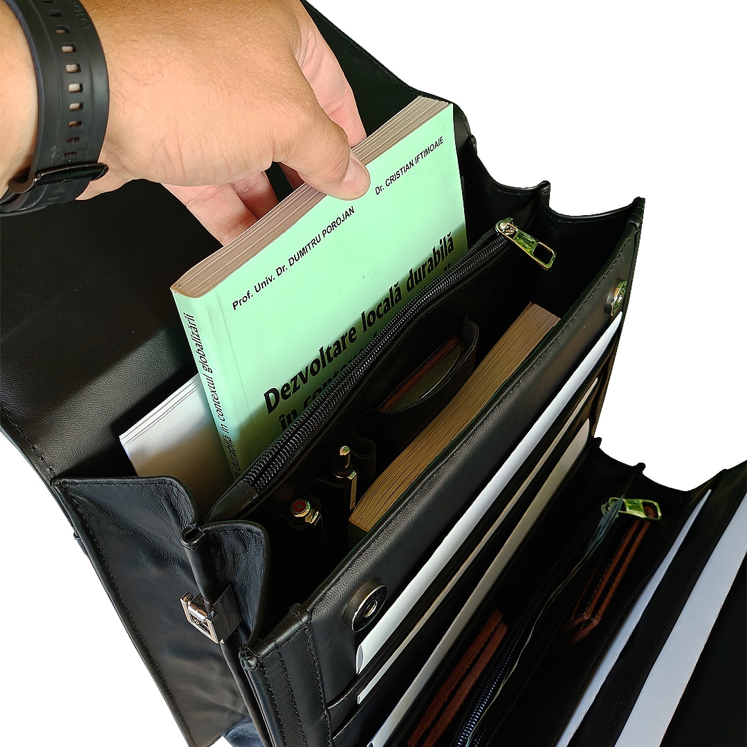 ✔️ Compartimentare inteligentă: Spații bine delimitate pentru documente, laptop slim /tabletă, instrumente de scris și alte accesorii.